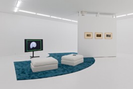 Curved Flatscreen 50 Zoll, curved carpet, 2 white leather seats, 4 drawings by Paul Gauguin of the collection Kunstmuseum Basel