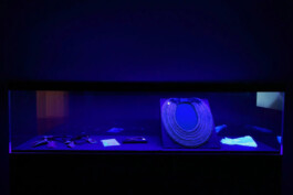 Europium, Hessisches Landesmuseum Darmstadt, 2019 Ausstellungsansicht Vitrine Ozeanische Gefühle, Hessisches Landesmuseum Darmstadt, 2019 Museumsvitrine 180 cm x 40 cm, fluoreszierendes Licht, Muschelgeld aus der Sammlung des Hessischen Landesmuseums, Archivkarte, Handschuhe