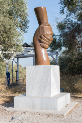 Push to Pull - Study of a Monument is an attempt to make sense of a monument now in neglect and its relationship to the European struggle for identity and cohesion at a moment where the union is heading towards isolation and a toughened stance towards migration. At the entrance to the former refugee camp Kara Tepe on the island of Lesbos stands the abandoned sculpture titled Solidarity, commissioned in 2015 by the city from a local sculptor. Lesbos — internationally known for overcrowded camps like Moria and Kara Tepe — remains a central site of European migration policy, shaped by systematic yet scarcely documented pushbacks in which asylum seekers are violently forced back into the Aegean Sea. At the same time, humanitarian aid is increasingly criminalized, framed as a supposed pull factor.